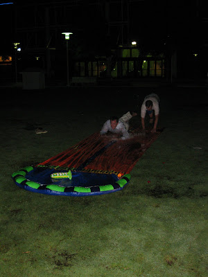 The groom (left) and his father racing down the slip-n-slide.